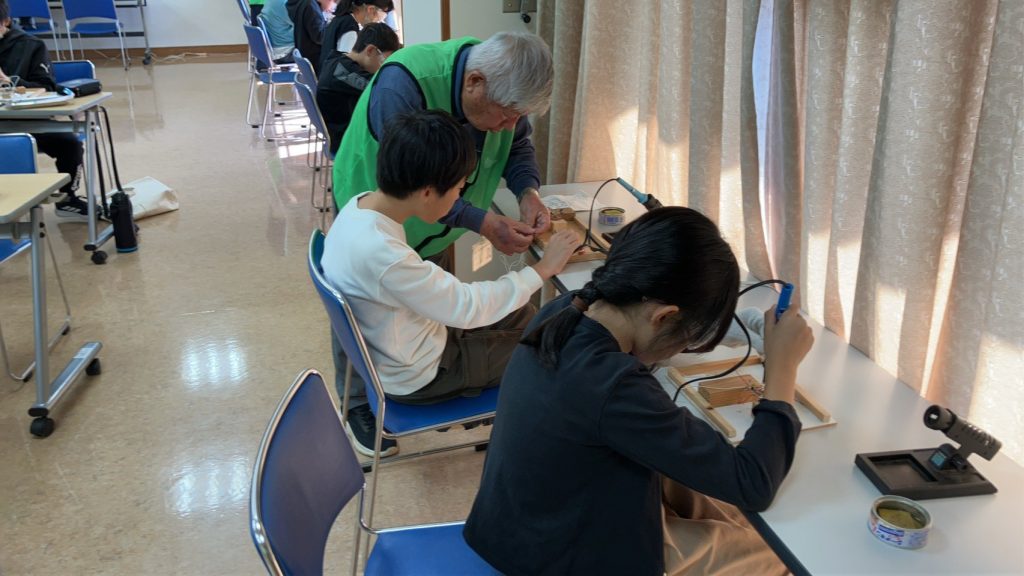 前回、基板(内側)に取り付けたコンデンサーやトランジスタ、抵抗を、今回外側に取り付け、半田付けを行いました。