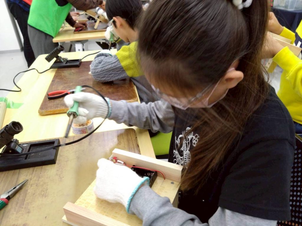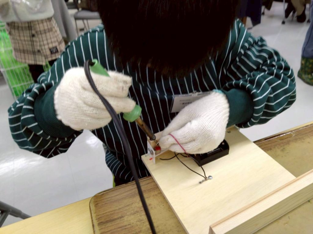次に各部分のリード線をはんだ付けで接続しました。3カ所目をする頃には、すっかり作業に慣れた様子でした。その後ヒーター線を取り付け完成です。